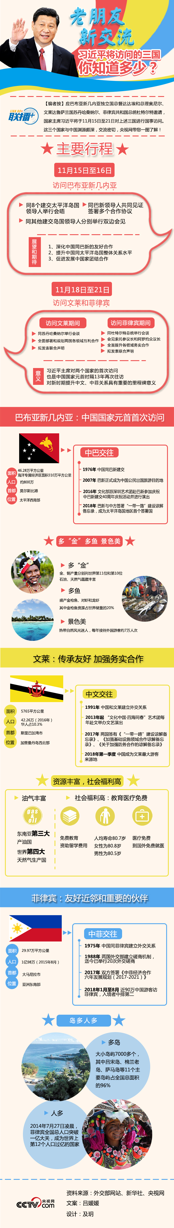 【联播+】11月15日至21日,习近平主席将对巴布亚新几内亚、文莱、菲律宾进行国事访问,并在巴新同建交太平洋岛国领导人会晤。习近平主席此次访问将进一步加深中国与上述三国及建交太平洋岛国的政治互信,深化友谊,为双边关系发展注入新活力,谱写亚太合作新篇章。央视网《联播+》栏目,图解此访主要行程,带您了解这三个国家与中国的渊源交流。