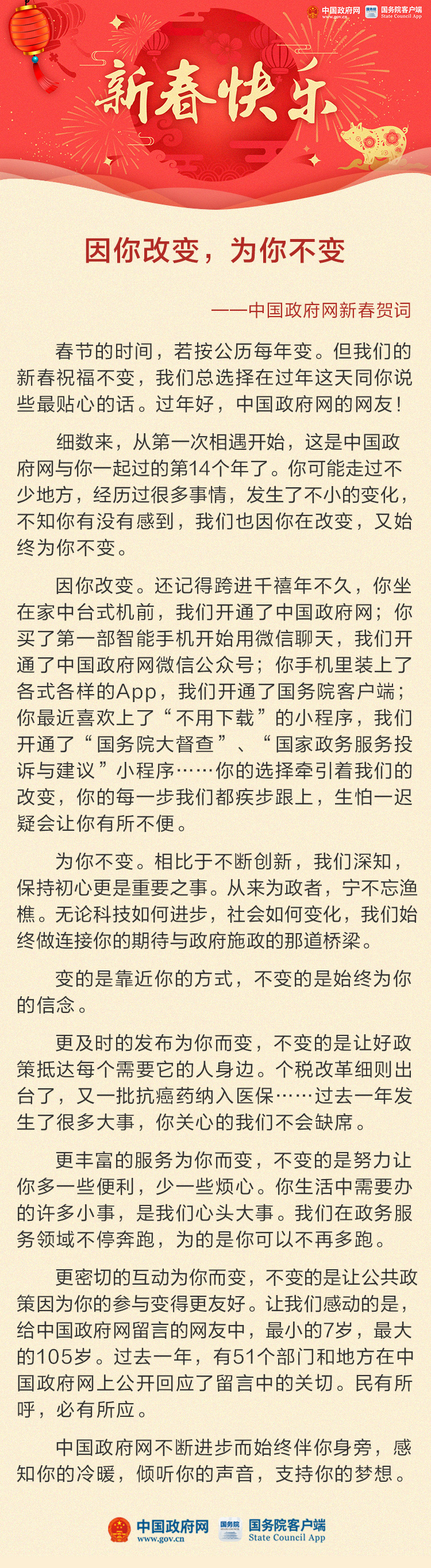 因你改变。还记得跨进千禧年不久,你坐在家中台式机前,我们开通了中国政府网;你买了第一部智能手机开始用微信聊天,我们开通了中国政府网微信公众号;你手机里装上了各式各样的App,我们开通了国务院客户端;你最近喜欢上了“不用下载”的小程序,我们开通了“国务院大督查”、“国家政务服务投诉与建议”小程序……你的选择牵引着我们的改变,你的每一步我们都疾步跟上,生怕一迟疑会让你有所不便。