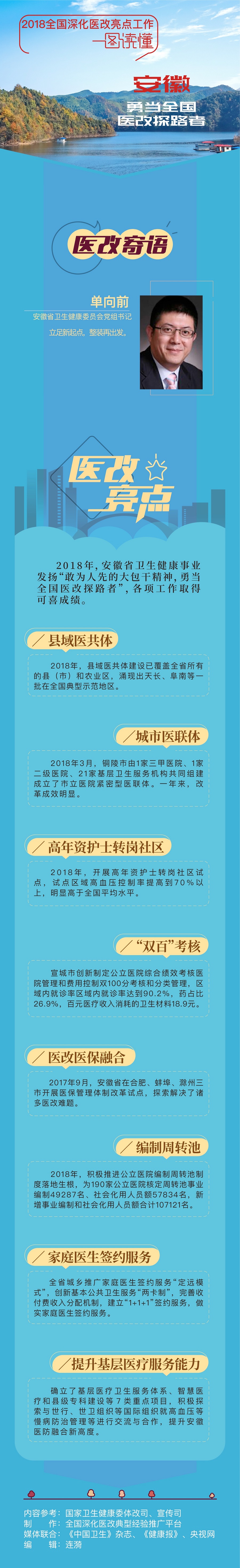 要做好今年的工作,必须以去年的工作为基础。2018年,各地卫生健康委深化医改主要负责人都有什么感悟?围绕医改五项重点工作都涌现了哪些亮点?为此,在国家卫生健康委员会体制改革司和宣传司的指导下,全国深化医改典型经验推广平台联合央视网推出31个省、市、自治区和新疆生产建设兵团的2018深化医改亮点工作一图读懂,期待您的关注!