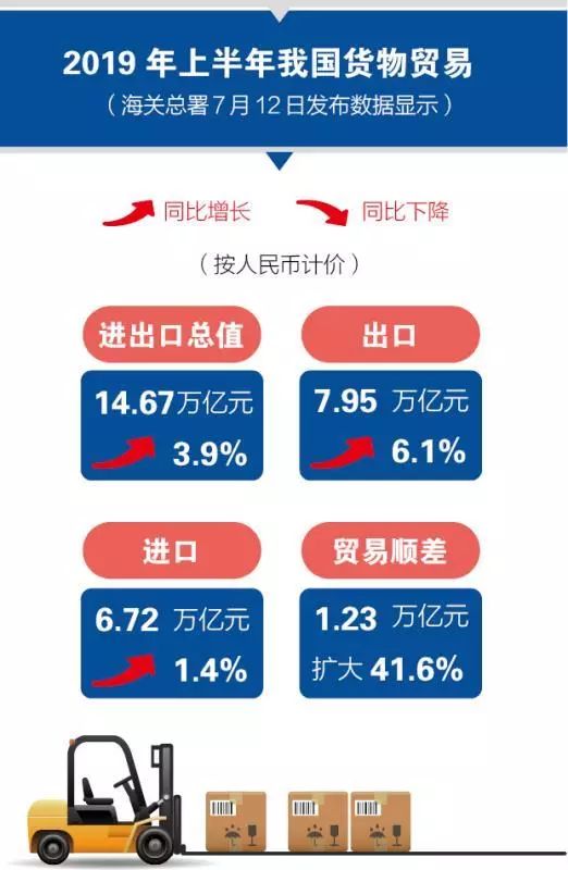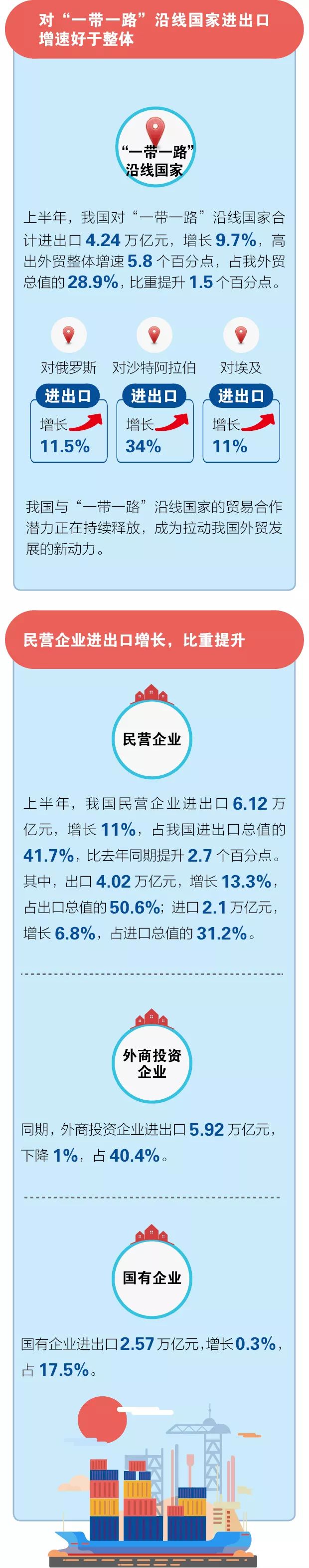 三是多元化出口市场开拓效果显著。上半年,民营企业占我国出口总额的50.6%,首次成为我国出口总额的半壁江山,对东盟、非洲、拉美等新兴市场分别增长19.3%、13.4%和9.9%,对“一带一路”沿线国家出口增长9.5%,出口市场更趋多元化。