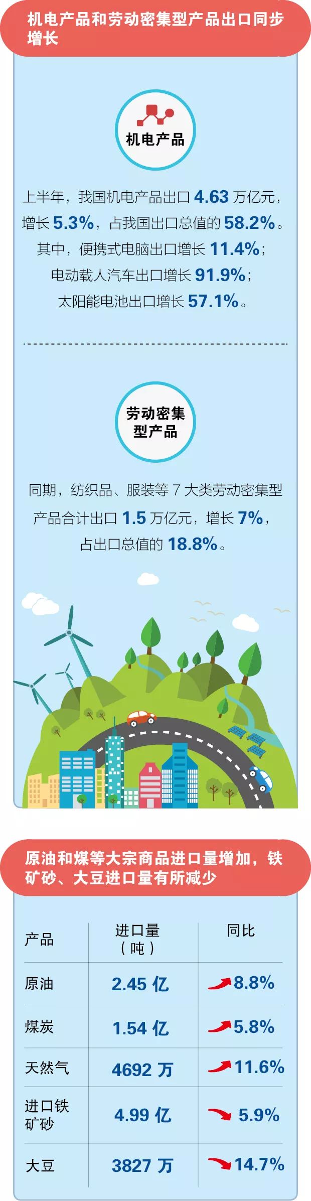亮点四,进出口产品结构持续优化。机电产品仍是我国出口主打产品,占我国出口近6成的机电产品,上半年出口增长了5.3%,为我国出口增长奠定了基础。其中,部分附加值较高的机电产品和装备制造产品出口都保持了良好的增长态势。刚才也给大家介绍了,比如电动载人汽车出口增长91.9%,太阳能电池增长57.1%,金属加工机床增长23.8%,风力发电机组增长1.9倍等。进口方面,消费品等进口也呈现了明显增长的态势。比如说,上半年我国进口水海产品和化妆品分别增长39.1%和46.5%,进口医药品和医疗器械分别增长了26.5%和13.1%。谢谢。