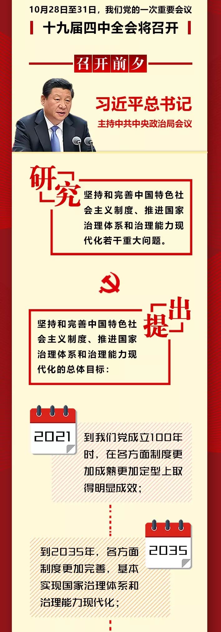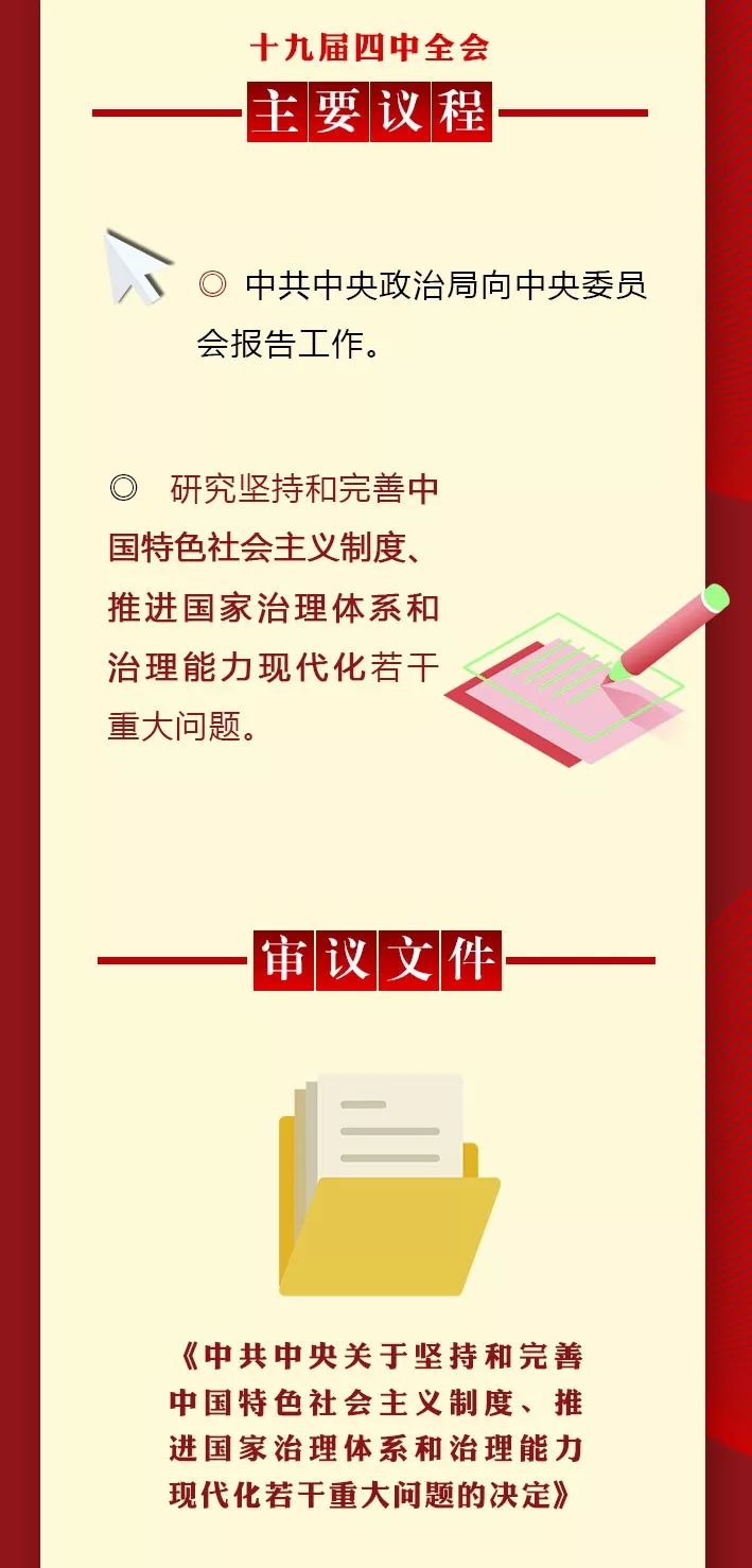 长安君(ID:changan-j):中国共产党第十九届中央委员会第四次全体会议28日上午在京召开。中央委员会总书记习近平代表中央政治局向全会作工作报告,并就《中共中央关于坚持和完善中国特色社会主义制度、推进国家治理体系和治理能力现代化若干重大问题的决定(讨论稿)》向全会作了说明。