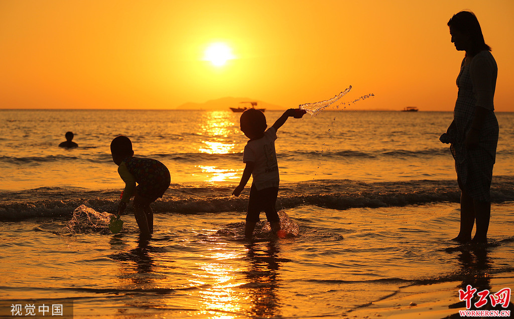 海南三亚:初冬夕阳美不胜收 游客海边享受生活
