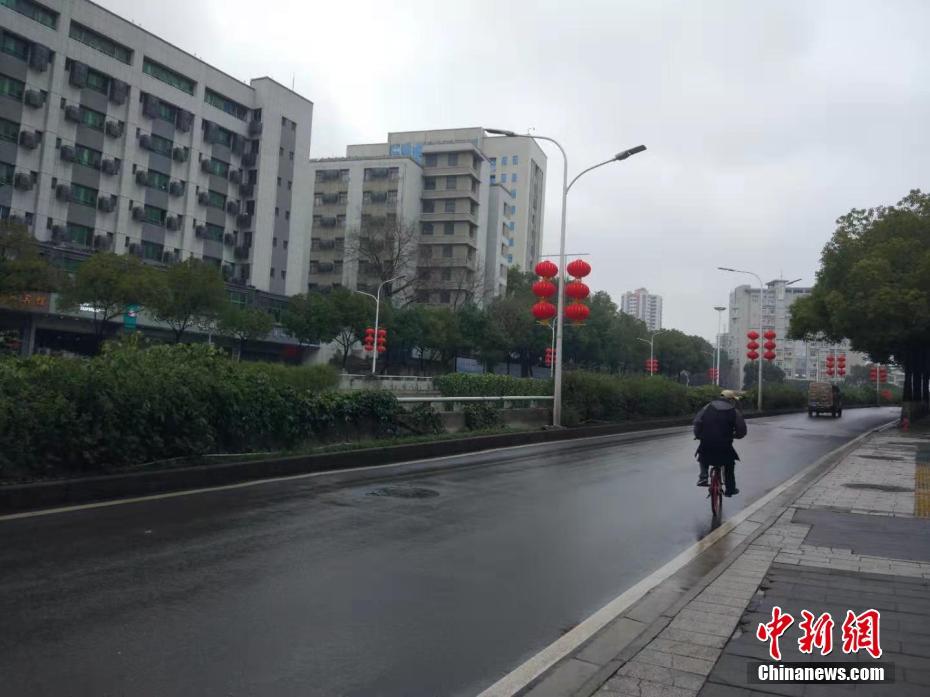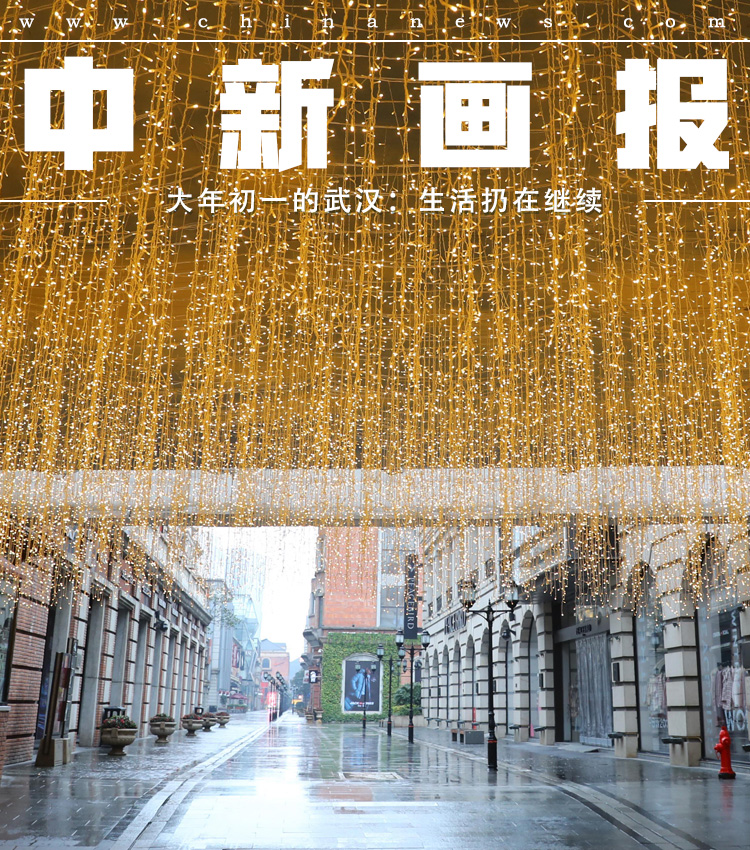 农历大年初一,武汉依旧阴冷,不时还飘着细雨。空旷的街头悬挂着精美的迎新春饰品。往年,这一天的街头巷尾,总会看到人们手拎各种礼品相互拜年。而当天,路上却鲜有行人,偶尔一两个人走过,也是戴着口罩,步履匆匆。中新社记者 张畅 摄
