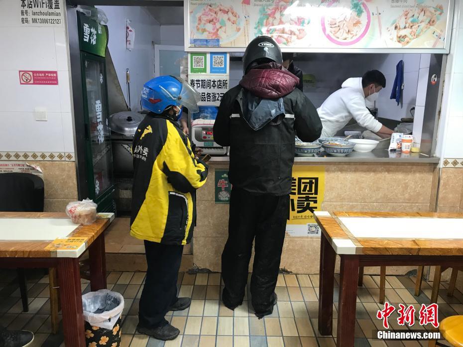 位于武汉市兴业路附近的一家拉面馆仍在营业,拉面馆内,“快递小哥”林加明(左)正在排队取餐。中新社记者 张芹 摄