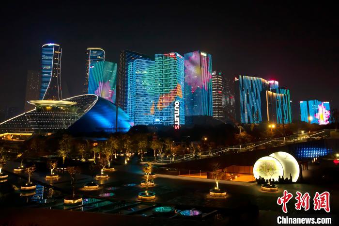 浙江杭州上演新年灯光秀 绚丽光影点亮钱塘江畔