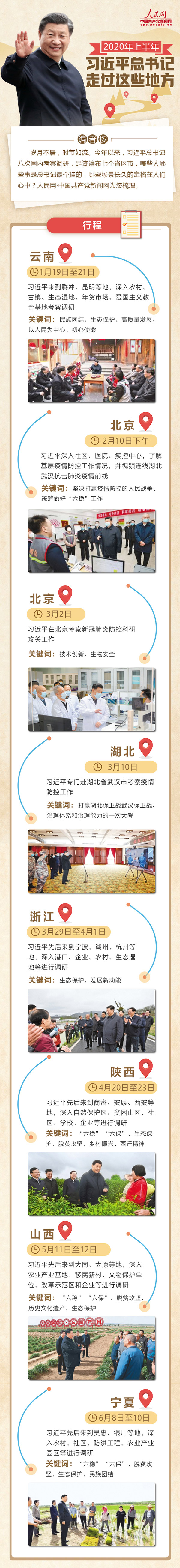 细数今年上半年,习近平夙夜在公,勤勉工作,不断刷新“忙碌指数”:数十次出席重要会议部署各项工作,8次国内考察,调研足迹遍及7省区市,3次出席国际重要会议并发表讲话,20余次致信、回信海内外人士,60次就疫情防控等话题与40余位外国政要和国际组织负责人通电话……人民网·中国共产党新闻网推出系列图解报道,带您全方面回顾习近平的2020上半年。