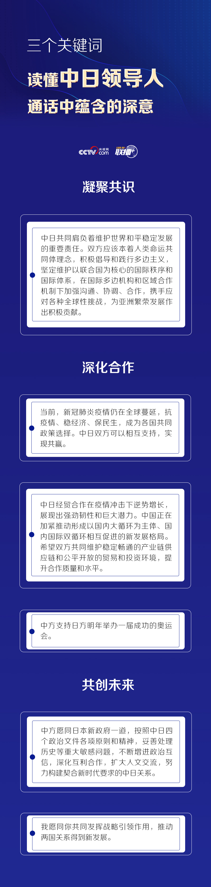 9月25日晚,习近平主席同日本首相菅义伟通电话。通话中,两国领导人就中日关系、深化各领域合作等话题进行交流。具体通话内容,央视网《联播+》为您梳理。