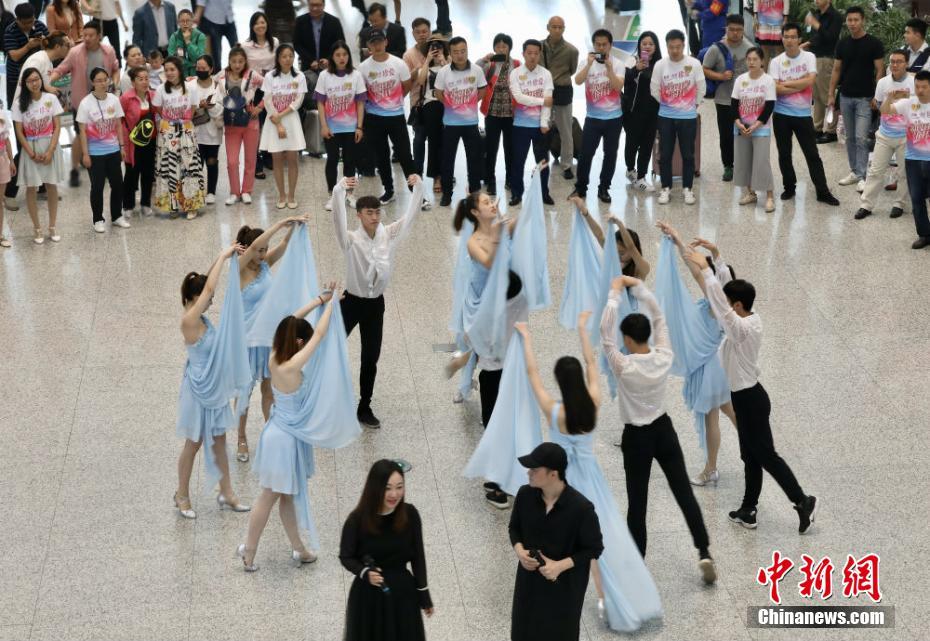 5月20日,近百名单身男女齐聚南京禄口机场,参加主题为“因为爱情”的相爱快闪,随后与江苏卫视主持人孟非、江苏交通广播主持人磊磊和娜娜一起乘上地铁列车,来了一场车厢内的珍爱相亲会。当日,因5月20日谐音“我爱你”,各地纷纷举办各种相亲活动。图为舞蹈演员们与单身男女一起跳舞蹈玩快闪。 泱波 摄