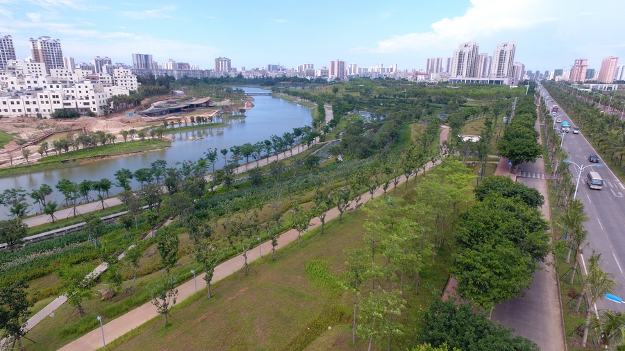 6月的海南十分炎热,但走在美舍河凤翔湿地公园中,满眼都是绿色,风从河面吹过,带来阵阵清凉。公园内有人工打造的“梯田”湿地1.4万平方米,不仅美化了城市景观,还能够起到净化污水的作用。