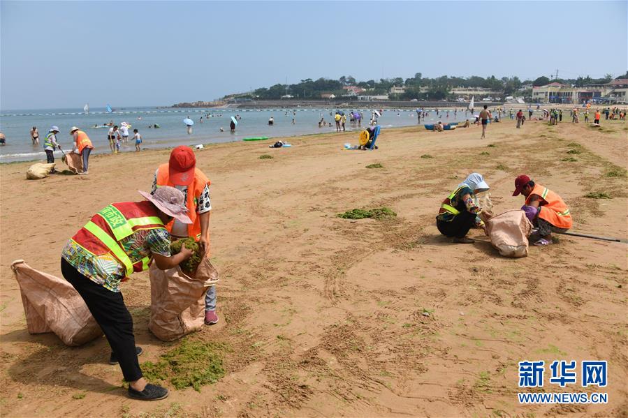 7月29日,青岛第三海水浴场,市政环卫人员在海滩上清理浒苔。 暑期以来,前往青岛海滩避暑纳凉的游客络绎不绝。为此青岛市政环卫部门专门组建了海滩保洁团队,负责及时清理海滩上的垃圾,为游客们提供一个洁净舒适的旅游环境。 新华社记者 李紫恒摄