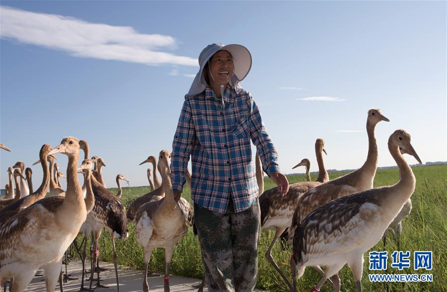 在黑龙江扎龙国家级自然保护区的鹤类驯养繁育中心,47岁的夏燕辉从事小丹顶鹤繁育工作已有16个年头了。因为经常领着几十只鹤宝宝出去玩,同事们亲切地称她为“鹤妈妈”。 夏燕辉负责的是丹顶鹤的孵化育雏工作,同在繁育中心工作的丈夫王晓明也会在早晚帮忙。 每年4月到10月末,夫妻俩白天晚上都守在繁育中心,全心照顾当年新孵化的鹤宝宝。