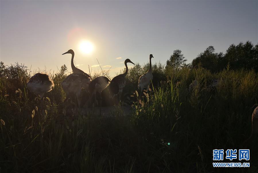 7月31日在鹤类驯养繁育中心拍摄的夕阳下的小丹顶鹤。 新华社记者 鱼澜摄
