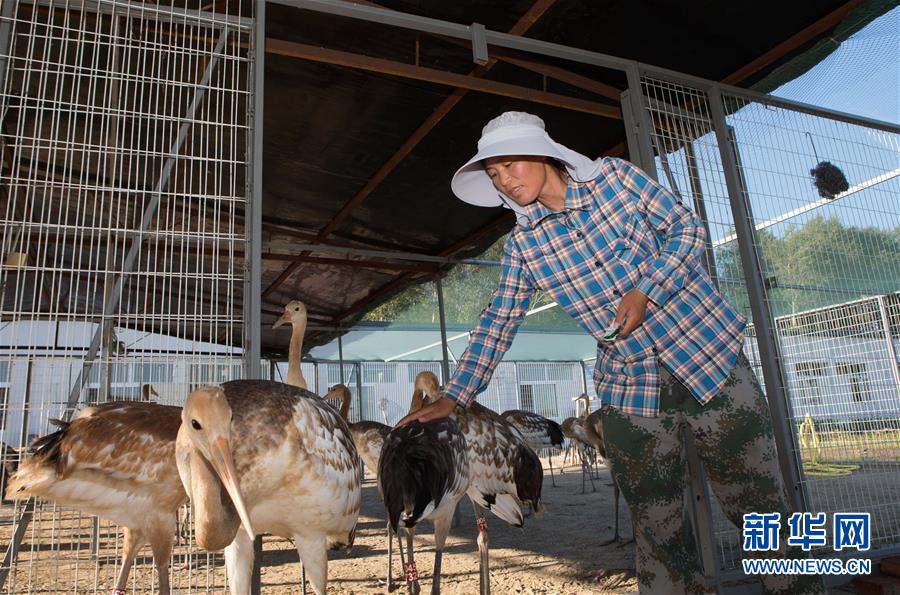 7月31日,夏燕辉在鹤类驯养繁育中心笼舍内检查一只小丹顶鹤的羽毛。 新华社记者 孟晨光摄