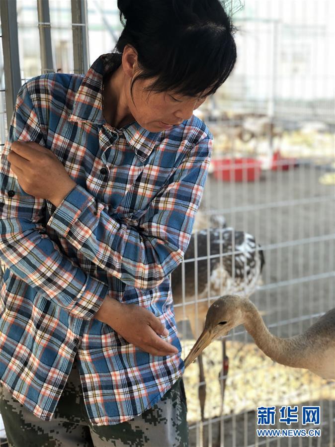 7月31日,在鹤类驯养繁育中心,夏燕辉与笼舍内的小丹顶鹤互动。 新华社记者 吴瑕摄