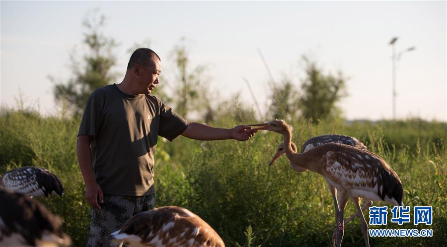 7月31日,在鹤类驯养繁育中心,王晓明与小丹顶鹤互动。 新华社记者 孟晨光摄