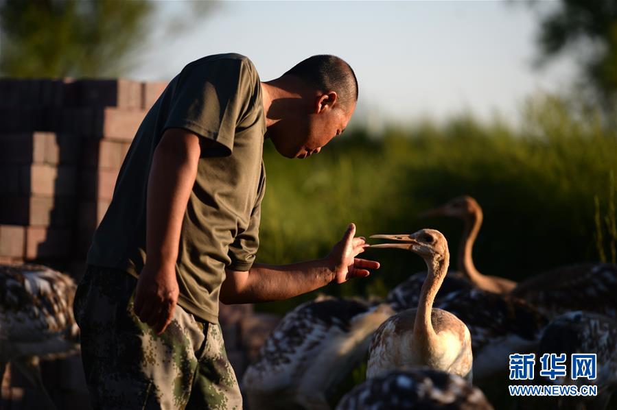 7月31日,在鹤类驯养繁育中心,王晓明与小丹顶鹤互动。 新华社记者 王凯摄