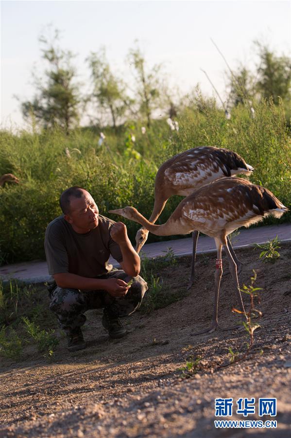 7月31日,在鹤类驯养繁育中心,王晓明与小丹顶鹤互动。 新华社记者 孟晨光 摄