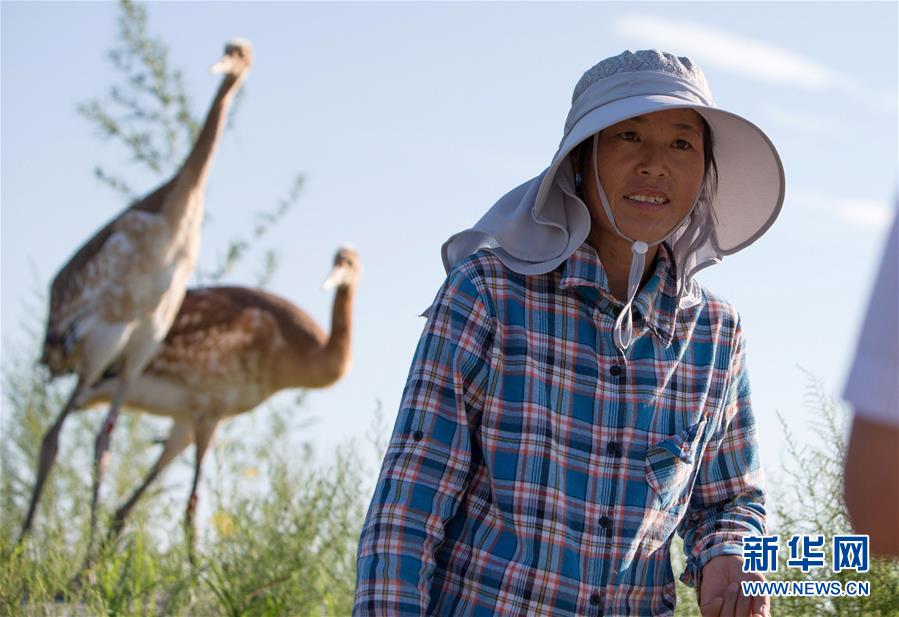 7月31日,夏燕辉带领小丹顶鹤返回鹤类驯养繁育中心。 新华社记者 孟晨光摄