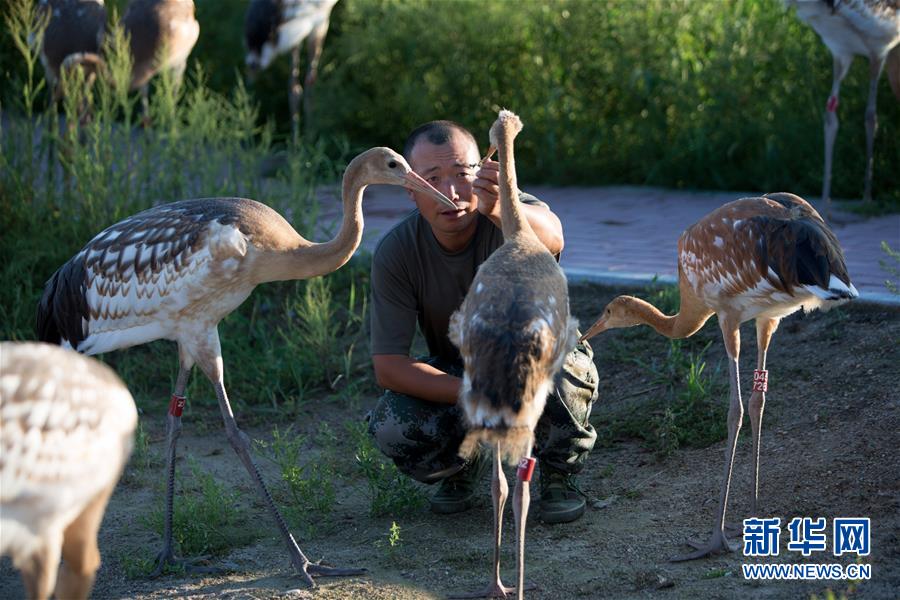 7月31日,在鹤类驯养繁育中心,王晓明与小丹顶鹤互动。 新华社记者 孟晨光摄