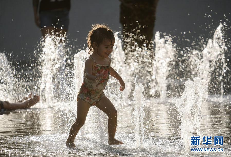 7月24日,在美国洛杉矶,一名儿童在公园喷泉中玩耍消暑。 新华社发(赵汉荣摄)