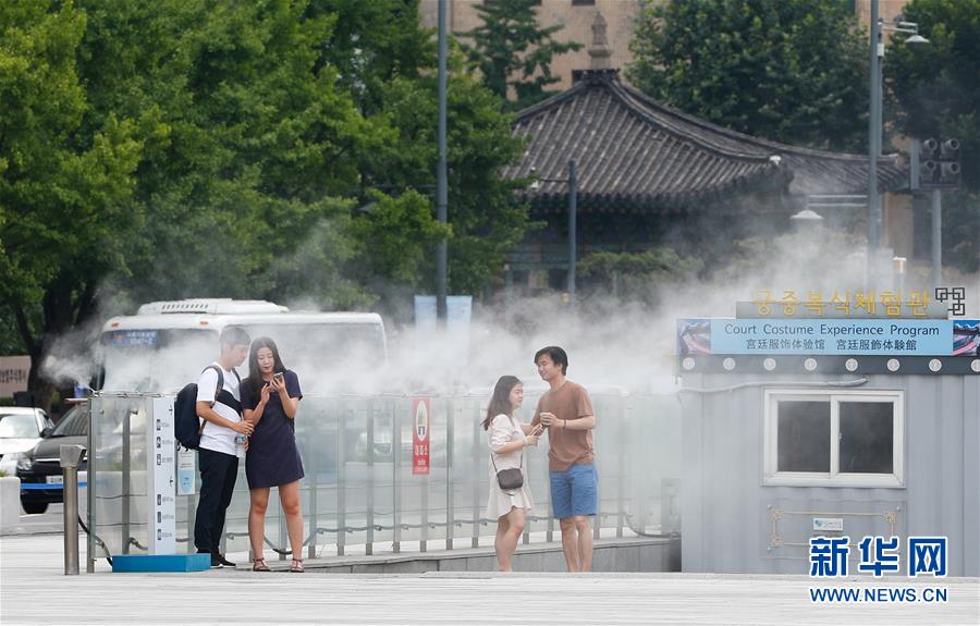 8月3日,在韩国首尔光化门广场,人们享受水雾的清凉。 新华社记者王婧嫱摄