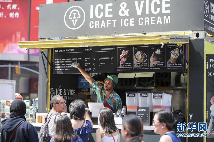 7月2日,在美国纽约时报广场,人们排队购买冷饮。 新华社记者王迎摄
