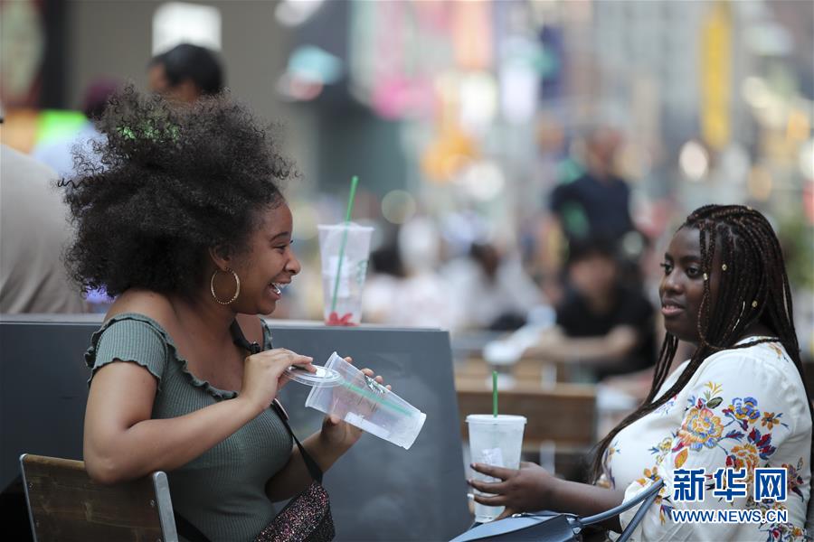 7月2日,在美国纽约时报广场,人们喝水休息。新华社记者王迎摄