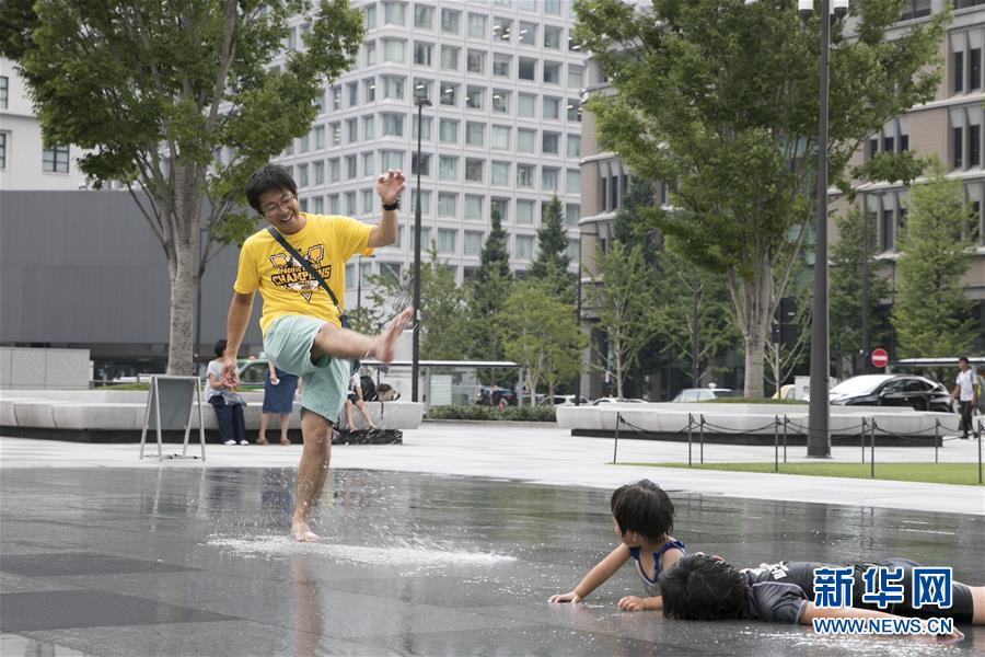 8月3日,在日本东京都东京站前,一名父亲带着孩子们戏水纳凉。东京站前广场部分区域设有地面流水系统,水深约5毫米,为地面降温。新华社记者杜潇逸摄
