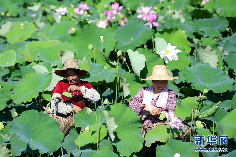 在安徽肥西县铭传乡桂树社区富绿家庭农场,农民在高温天气下采摘莲蓬(7月19日摄)。 新华社发(徐勇摄)