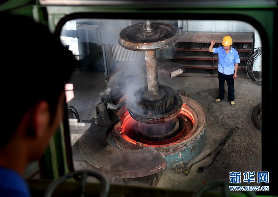 郑州机务段轮轴车间车轮组工人王起源在指挥作业(7月25日摄)。当日,河南省郑州市的气温接近40摄氏度。 新华社记者 李嘉南 摄