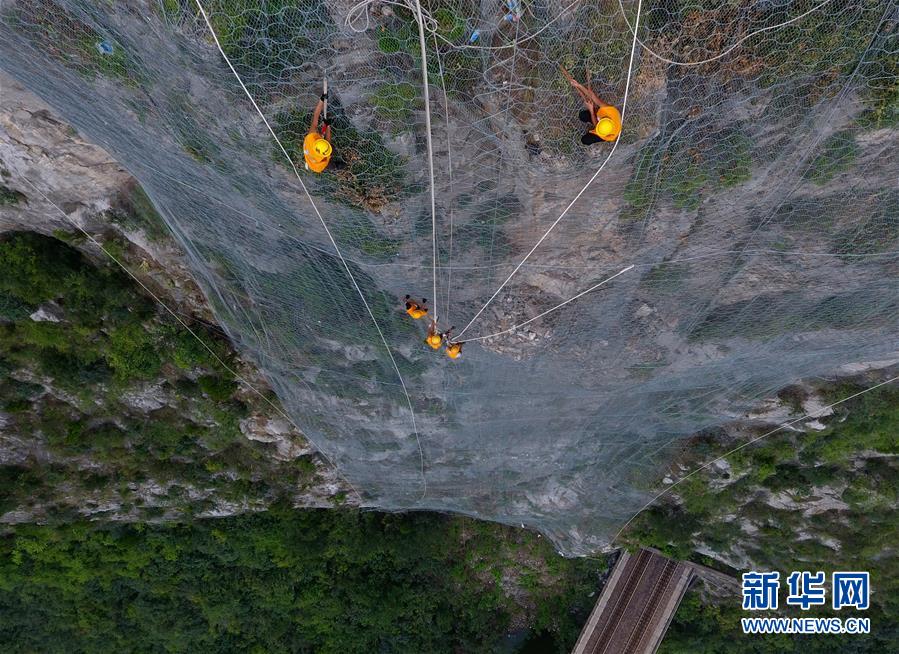8月9日,抢险人员在侯月铁路柏枝隧道上方悬崖进行碎石作业(无人机拍摄)。 新华社记者李嘉南摄