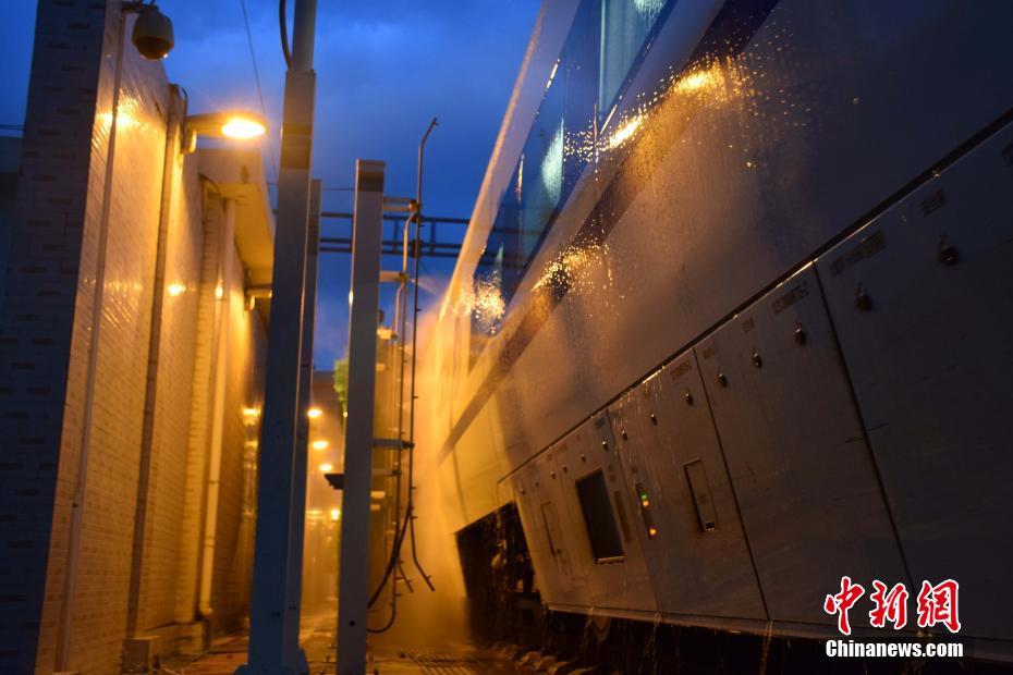 8月15日,受台风“贝碧嘉”影响,海南环岛高铁停运,动车组提早回“港”——中国铁路广州局集团公司广州动车段三亚动车运用所避风,接受检修、清洁。图为动车组入库清洁。李军 摄