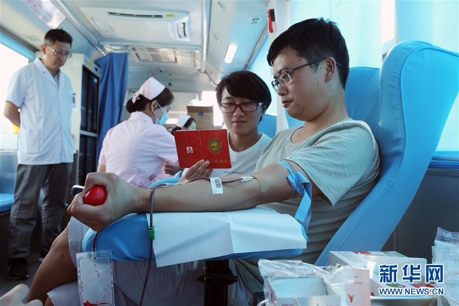 8月14日,在德清县乾元镇组织的献血活动现场,严红芳(右二)陪着费云峰献血。 新华社发(倪立芳 摄)