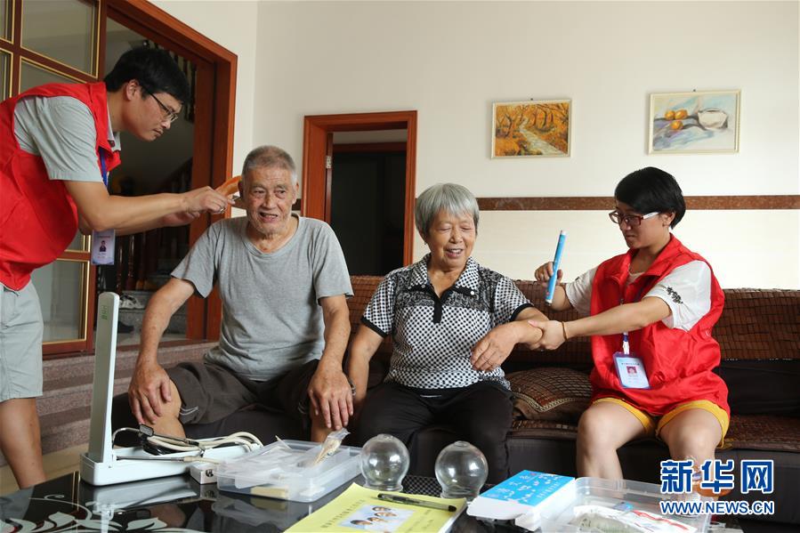 8月13日,在德清县乾元镇联合村,费云峰(左)、严红芳(右)为村民进行慢性病治疗。 新华社发(倪立芳 摄)