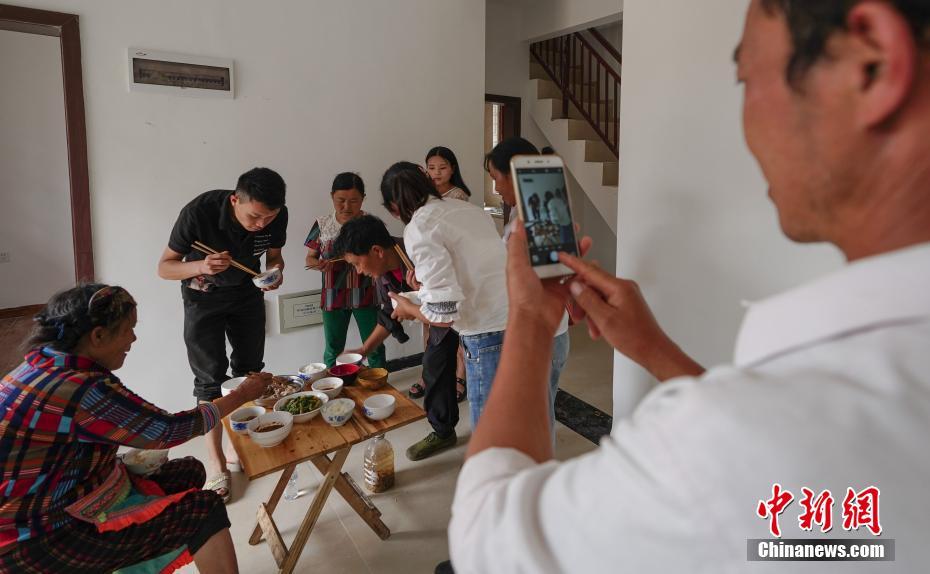 8月27日,贵州晴隆,搬迁民众在安置点新家吃午餐。当日,贵州省黔西南布依族苗族自治州晴隆县三宝彝族乡举行集中搬迁入住仪式,全乡150户700余人入住位于晴隆县郊的安置点阿妹戚托小镇新家。三宝彝族乡距晴隆县城46公里,仅有一条狭窄的马路与外界连通,人均耕地0.34亩。2016年全乡5853人超4成为贫困户,贫困发生率高于全国50多个百分点,为彻底斩断“穷根”,三宝成为正在实施整乡搬迁的彝族乡。2018年,贵州易地扶贫搬迁项目计划搬迁66万人,建设132个安置点,全部实行城镇化集中安置。中新社记者 贺俊怡 摄