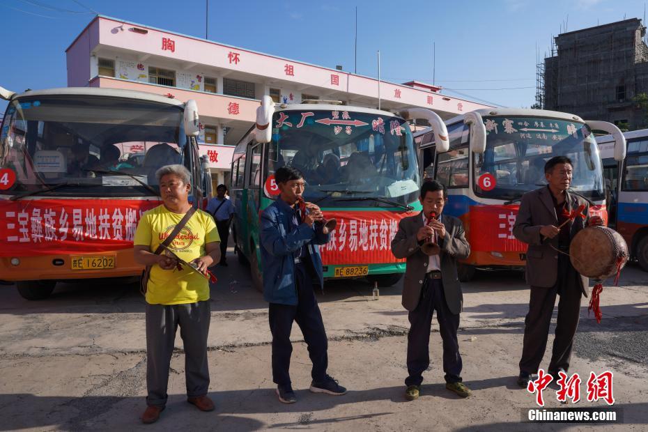 8月27日,贵州晴隆三宝彝族乡,民众在搬迁集合点吹奏唢呐庆祝乔迁大喜。当日,贵州省黔西南布依族苗族自治州晴隆县三宝彝族乡举行集中搬迁入住仪式,全乡150户700余人入住位于晴隆县郊的安置点阿妹戚托小镇新家。三宝彝族乡距晴隆县城46公里,仅有一条狭窄的马路与外界连通,人均耕地0.34亩。2016年全乡5853人超4成为贫困户,贫困发生率高于全国50多个百分点,为彻底斩断“穷根”,三宝成为正在实施整乡搬迁的彝族乡。2018年,贵州易地扶贫搬迁项目计划搬迁66万人,建设132个安置点,全部实行城镇化集中安置。中新社记者 贺俊怡 摄