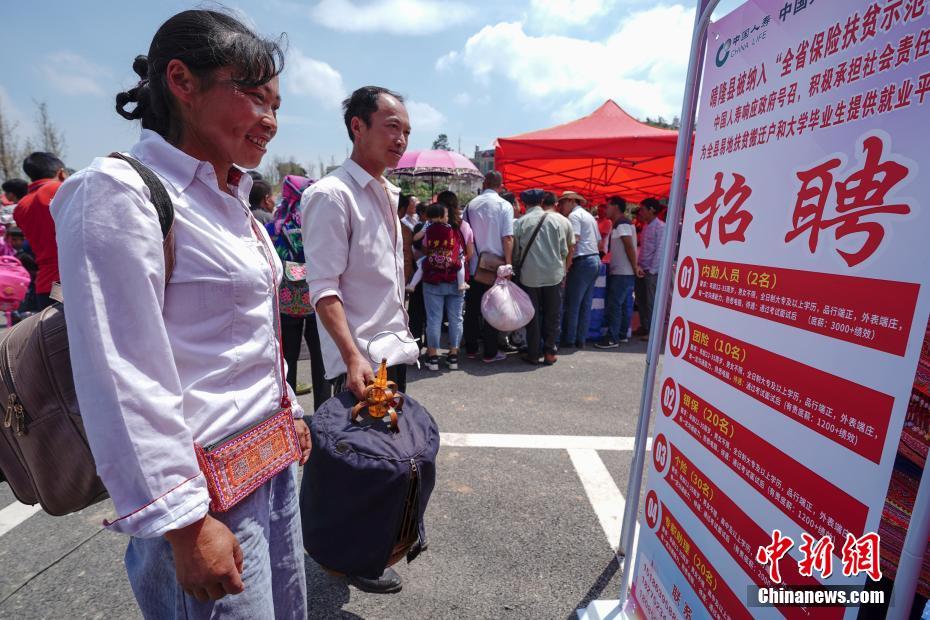 8月27日,贵州晴隆,搬迁民众在安置点阿妹戚托小镇了解招聘信息。当日,贵州省黔西南布依族苗族自治州晴隆县三宝彝族乡举行集中搬迁入住仪式,全乡150户700余人入住位于晴隆县郊的安置点阿妹戚托小镇新家。三宝彝族乡距晴隆县城46公里,仅有一条狭窄的马路与外界连通,人均耕地0.34亩。2016年全乡5853人超4成为贫困户,贫困发生率高于全国50多个百分点,为彻底斩断“穷根”,三宝成为正在实施整乡搬迁的彝族乡。2018年,贵州易地扶贫搬迁项目计划搬迁66万人,建设132个安置点,全部实行城镇化集中安置。中新社记者 贺俊怡 摄