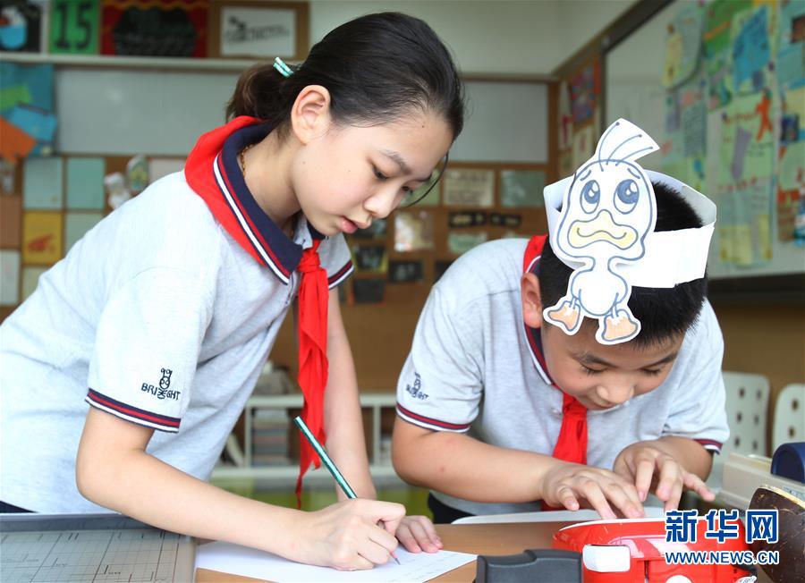 9月3日,上海市天山第一小学的学生放学后在“创意实验室”编写英文情景剧剧本。 新华社记者 胥晓璇 摄