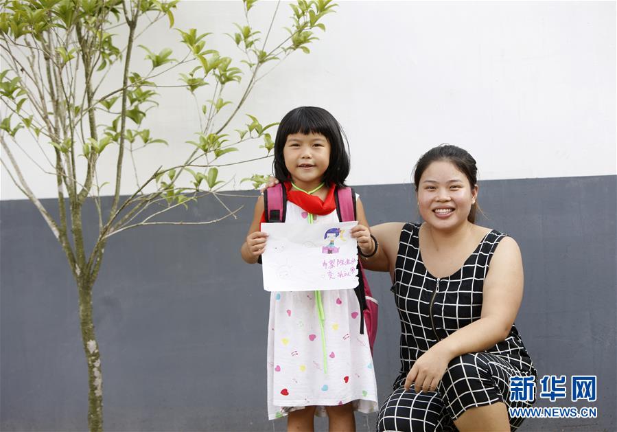 9月4日,一名小女孩将自己画的画送给陈春英,并与老师合影留念。 新华社记者段卓力 摄