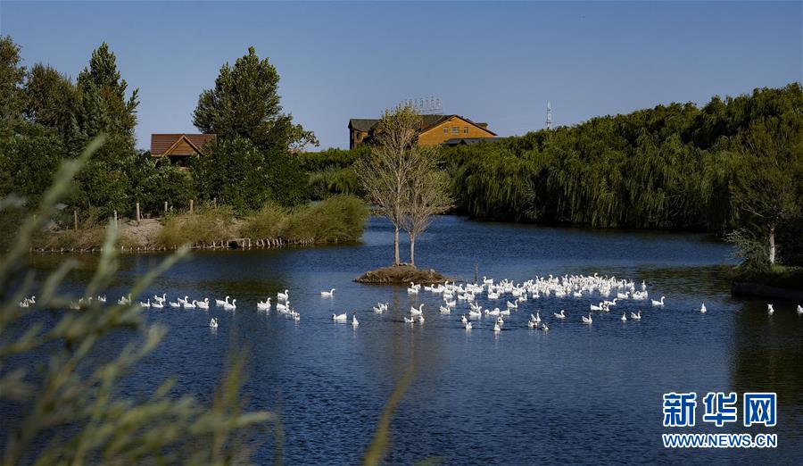 9月7日,一群白鹅在高台县黑河湿地游弋。 新华社记者陶明摄