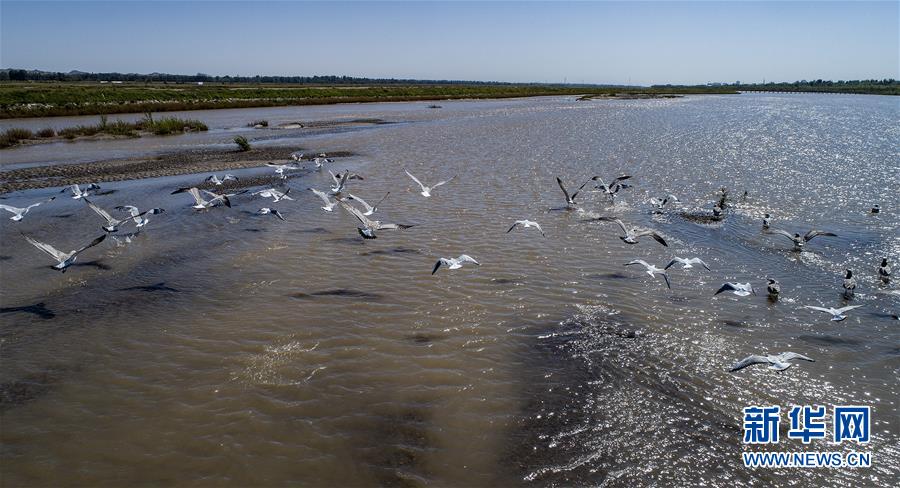 9月7日,一群鸟儿在高台县黑河湿地飞翔(无人机拍摄)。 新华社记者陶明摄