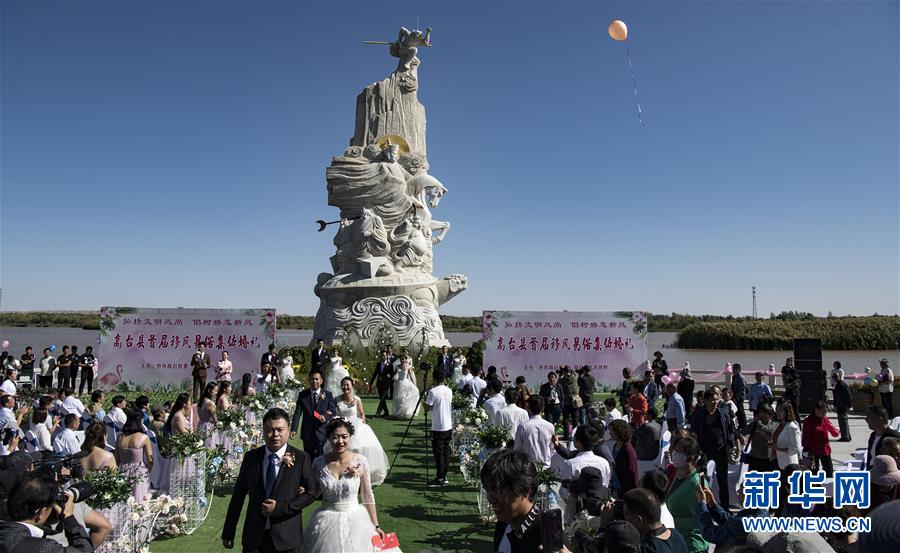 9月7日,高台县的12对新人在高台国家城市湿地公园举办集体婚礼。 新华社记者陶明摄