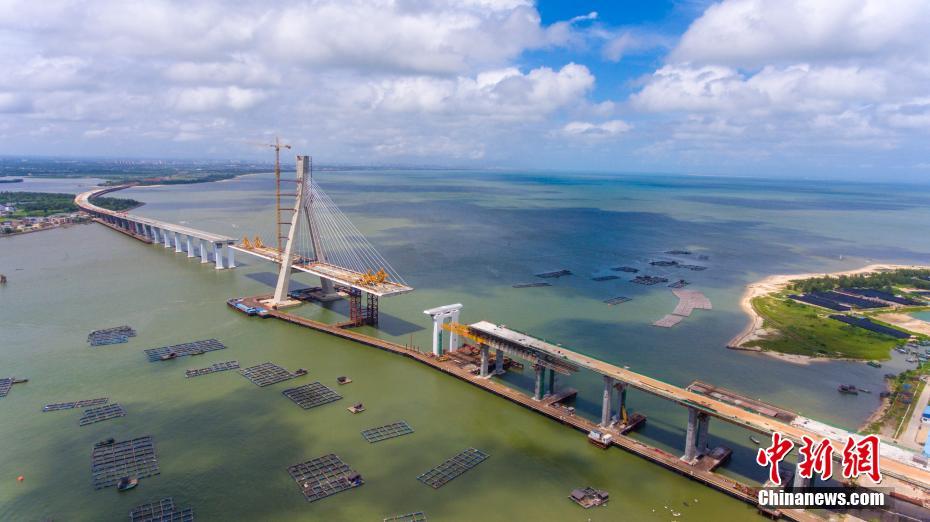 9月14日,正在建设中的海南铺前跨海大桥。海南铺前跨海大桥横跨海南岛东北部的铺前湾海域,全长5.597公里,总投资约30.1亿元人民币,目前已完成总工程量的80%,预计在今年年底建成通车。届时,从文昌铺前到海口的路程将由原来的1小时30分钟缩短至20分钟。据了解,该桥是目前中国国内抗震设防烈度最高、设计基本风速最大,且跨越地震带活动断层的跨海大桥,是中国首座跨地质断裂带的大型桥梁。中新社记者 骆云飞 摄