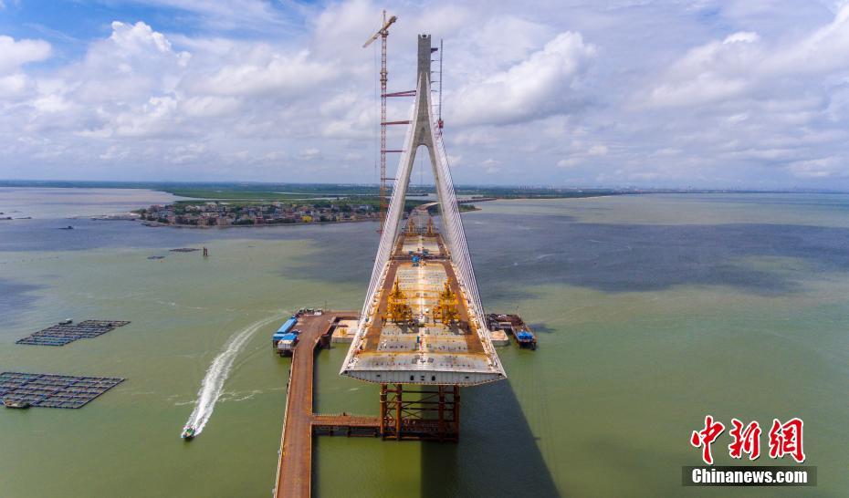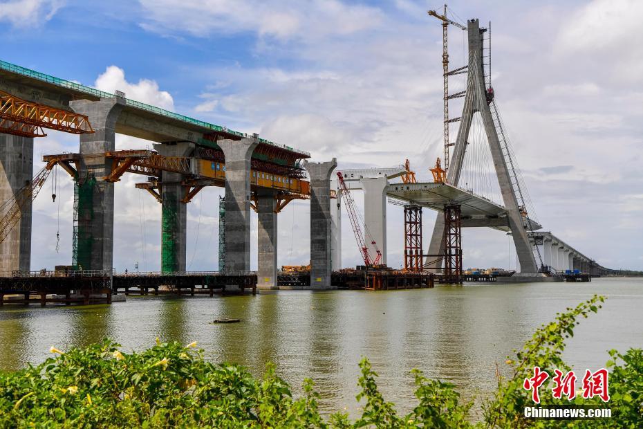 9月14日,正在建设中的海南铺前跨海大桥。海南铺前跨海大桥横跨海南岛东北部的铺前湾海域,全长5.597公里,总投资约30.1亿元人民币,目前已完成总工程量的80%,预计在今年年底建成通车。届时,从文昌铺前到海口的路程将由原来的1小时30分钟缩短至20分钟。据了解,该桥是目前中国国内抗震设防烈度最高、设计基本风速最大,且跨越地震带活动断层的跨海大桥,是中国首座跨地质断裂带的大型桥梁。中新社记者 骆云飞 摄