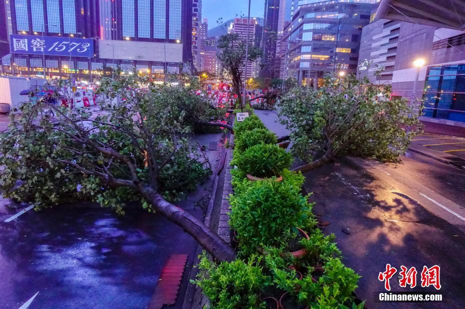 9月16日傍晚,强台风“山竹”袭击下的香港到处是倒塌的树木。通往金紫荆广场的绿化带上多棵大树被连根拔起。截至当天下午5时,香港特区政府1823电话中心收到179宗塌树报告。 中新社记者 张炜 摄
