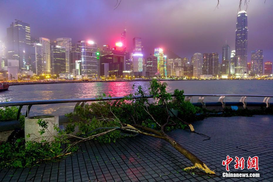 9月16日傍晚,强台风“山竹”袭击下的香港到处是倒塌的树木,被台风折断的树枝倒在金紫荆广场的海滨。截至当天下午5时,香港特区政府1823电话中心收到179宗塌树报告。 中新社记者 张炜 摄