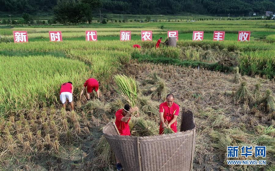 9月19日,在江西萍乡举办的“中国农民丰收节”主题活动上,人们参加水稻收割比赛。 新华社发(余和平 摄)