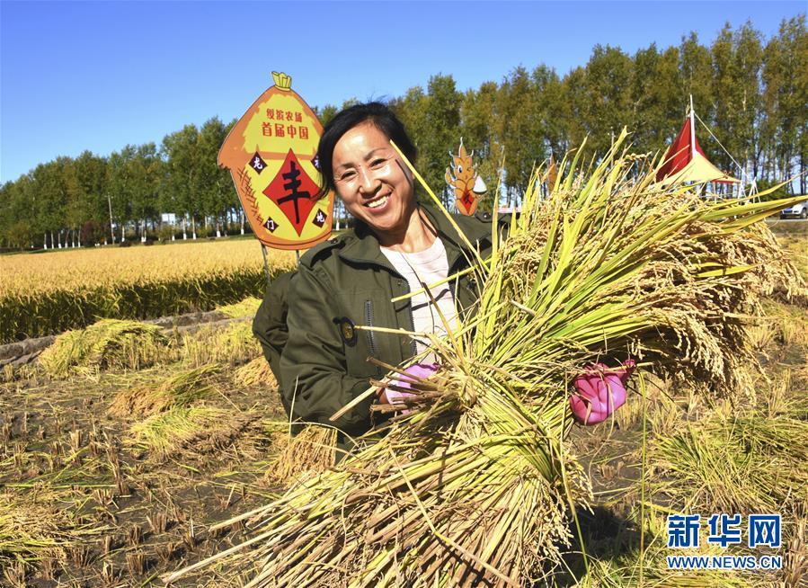 9月20日,在黑龙江垦区绥滨农场举行的丰收劳动竞赛上,一名职工抱着刚刚收割的水稻。 新华社发(刘洪军 摄)