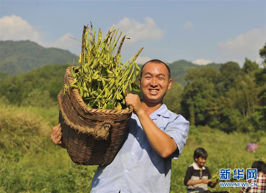 9月19日,江西省万载县赤兴乡浙桥村农民展示收获的有机毛豆。 新华社发(邓龙华 摄)